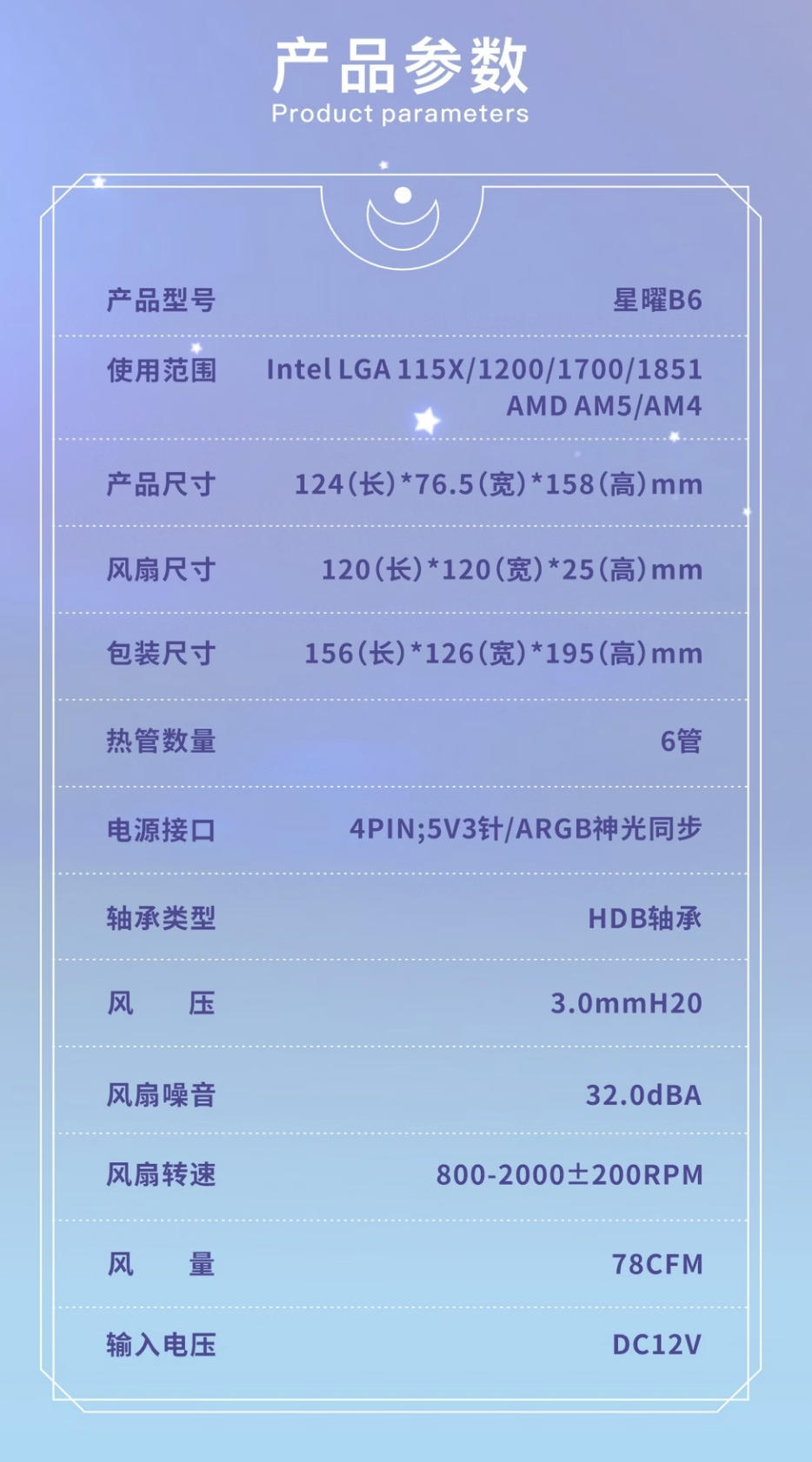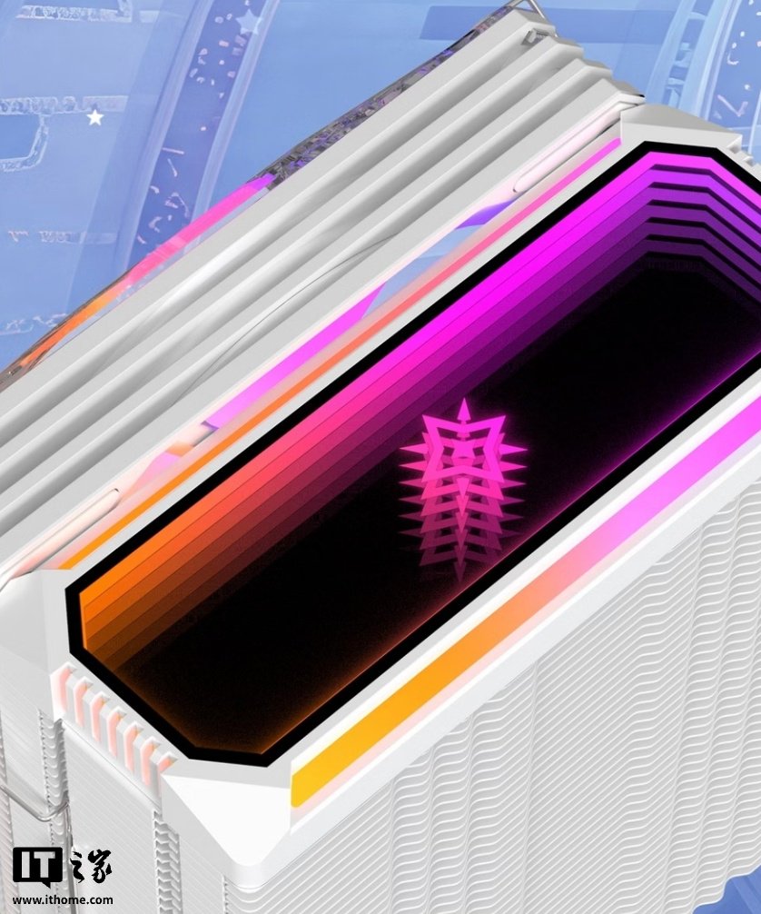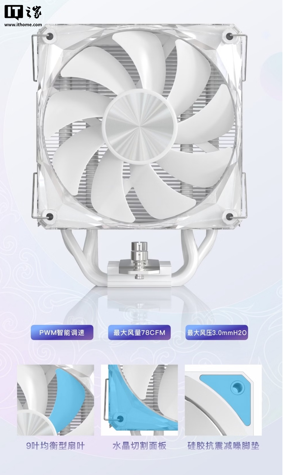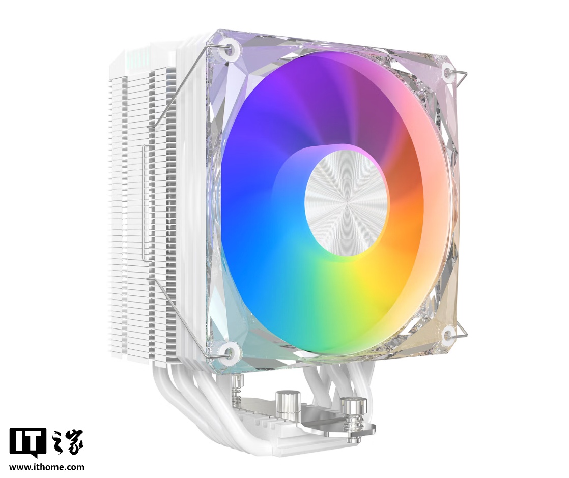 据介绍,该风冷散热器整体使用电竞风格,尺寸为 124 x 76.5×158 mm,顶部配备无限镜 ARGB 灯效顶盖,标配具有钻石切割造型的 12025 规格 HDB 液压轴承 ARGB 风扇(转速范围为 800–2000±10% RPM,最大风量 78 CFM,最大静压 3.0 mmH2O,噪音控制在 32 分贝内)。