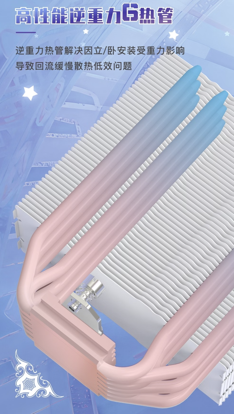 该风冷散热器采用内存避让设计,搭载六根 6mm 逆重力热管,配合热管直触工艺底座,可快速将热量传导至鳍片,提升散热效率。产品兼容英特尔 LGA 1851/1700/1200/115x 平台及 AMD AM5/AM4 平台,拥有一年质保。