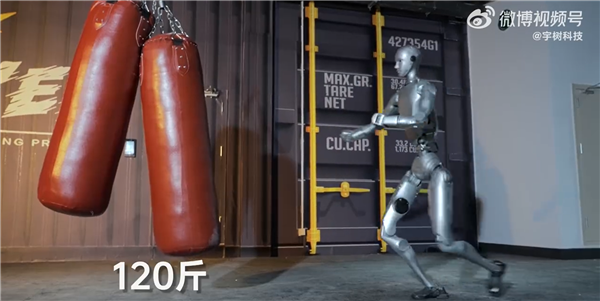 随后,机器人在空中展示了回旋踢,轻松将吊起来的西瓜踢得粉碎。不仅如此,还一脚将两个60公斤沙包踹开,并且稳稳站住。