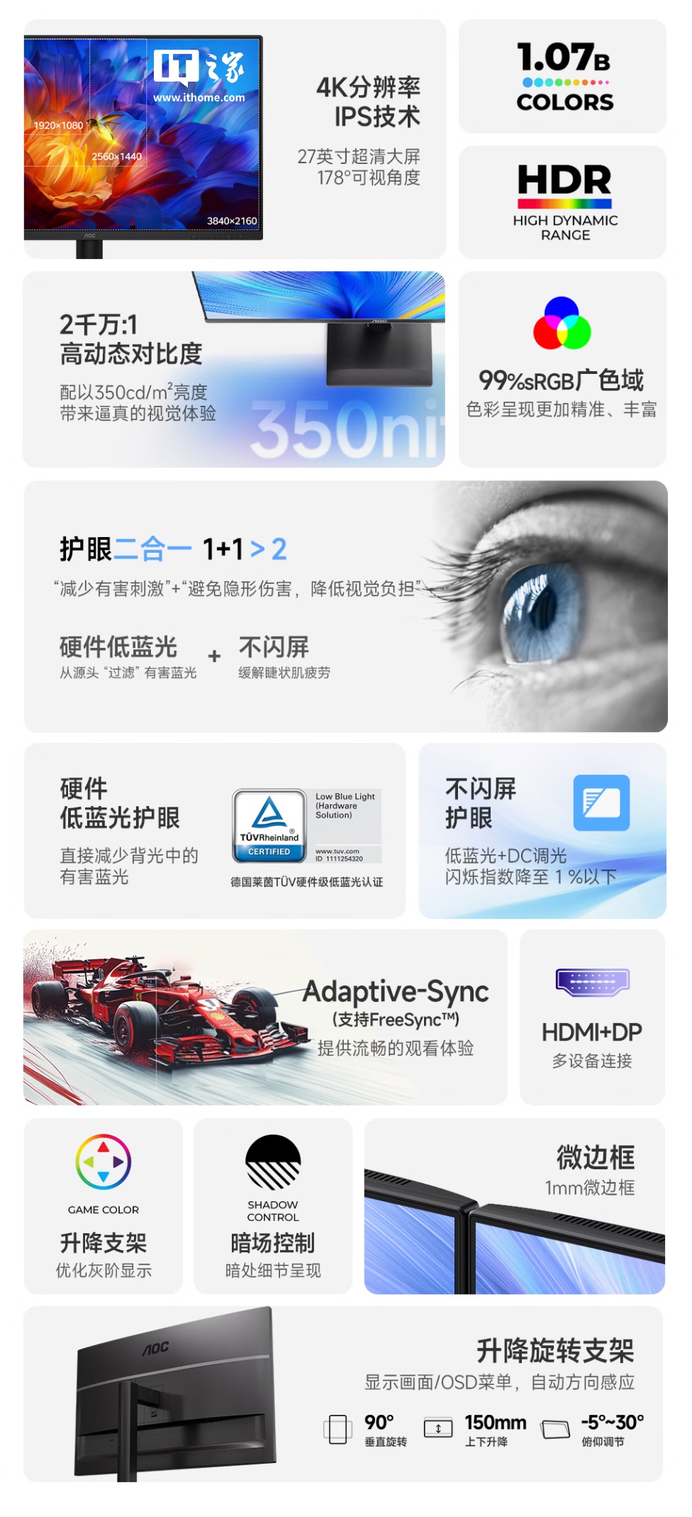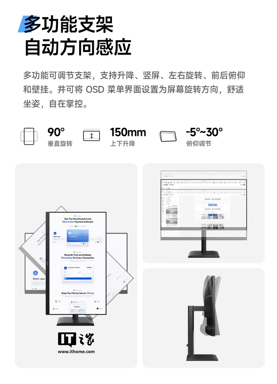 该机支架支持升降 / 倾斜 / 旋转(支持自动方向感应),显示器本体支持 100x100mm 壁挂,提供 1 个 HDMI 2.1、1 个 DP 1.4、1 个 3.5mm 音频接口。