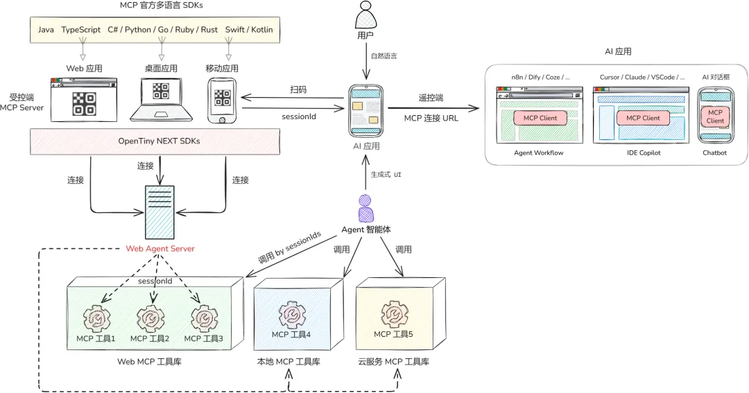 OpenTiny NEXT的核心创新在于构建了前端应用与AI智能体的标准化交互桥梁。通过WebMCP(Web Model Context Protocol)协议,开发者可将企业前端应用的功能封装为AI智能体可调用的MCP工具,再借助OpenTiny NEXT SDK连接Web Agent Server,让智能体能够精准识别用户意图并自主调用对应功能。相较于传统RPA方案,该技术在执行效率、准确率和成本控制上均实现质的提升,且完全兼容现有MCP生态,无需改动后端API服务及前端人机交互逻辑,大幅降低改造门槛。