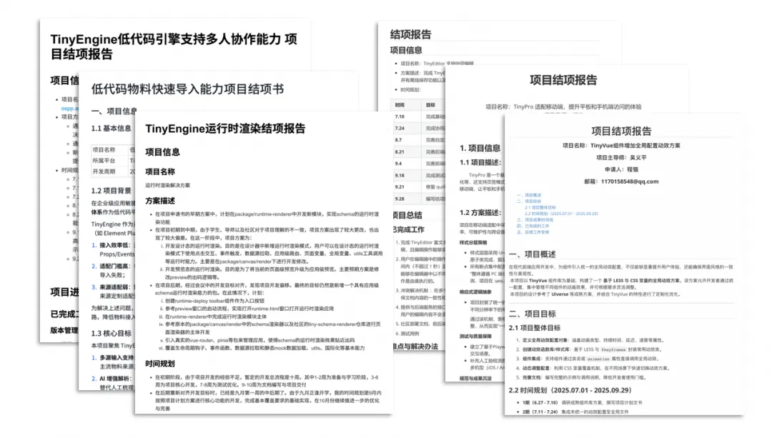 同时,也非常感谢所有投稿的开发者,包含Node.js系列文章作者屈金雄、曹杨毅;前端性能优化作者董福俊;字体性能优化作者张庭岑;AI知识科普作者合艳春;TinyVue相关内容作者曾令卡、郑志超、申君健、岑灌铭、刘坤等;TinyEngine相关内容作者伍其和、李锦浩、胡靖、王莉纯、李璇、李坤、观默等;OpenTiny开源之夏项目相关作者周天意、夏雯斐、张筠、张颢严、程锴、龚昱帆、宋子文、王晨光、周泽龙、张珈瑜、申曜枫、曹里林及其导师。