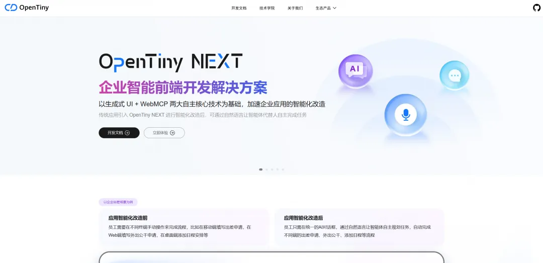 2025年,OpenTiny重磅推出OpenTiny NEXT前端智能化解决方案,以生成式UI + WebMCP两大技术为核心,革新传统前端应用的交互模式,实现”自然语言驱动任务自主完成”的智能化升级,为企业应用智能化改造提供了低成本、高效率的落地路径。