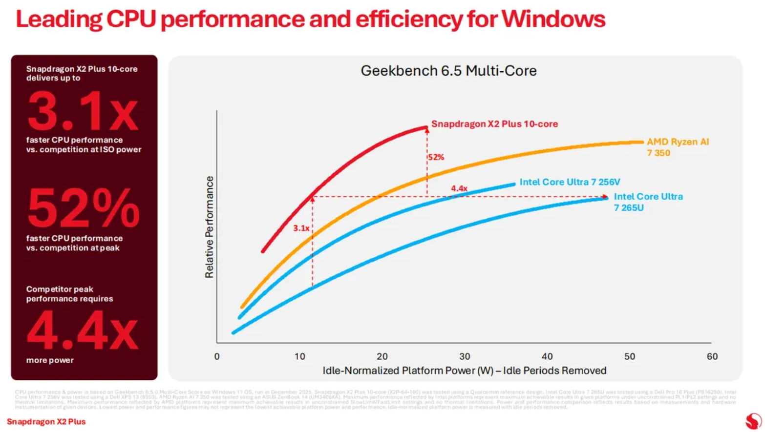 能效是高通最核心的卖点之一,其计划通过骁龙 X2 Plus 系列延续这一优势。高通称,在 Geekbench 6.5 基准测试的等功耗条件下(本测试中分别取 5 瓦和 10 瓦功耗),X2P-64-100 的单核性能达到英特尔酷睿 Ultra 7 265U 的 3.5 倍,多核性能达到后者的 3.1 倍。而在峰值功耗下,该型号的单核性能较酷睿 Ultra 7 265U 提升 28%,多核性能提升 52%。