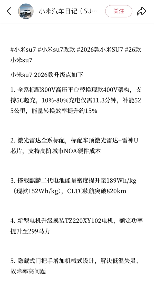 值得一提的是,去年11月份,,知名汽车博主“韩路”就曾透露“独家小道消息”称,小米SU7换代2026年第二季度上市,升级颇多,但价格要涨2万。