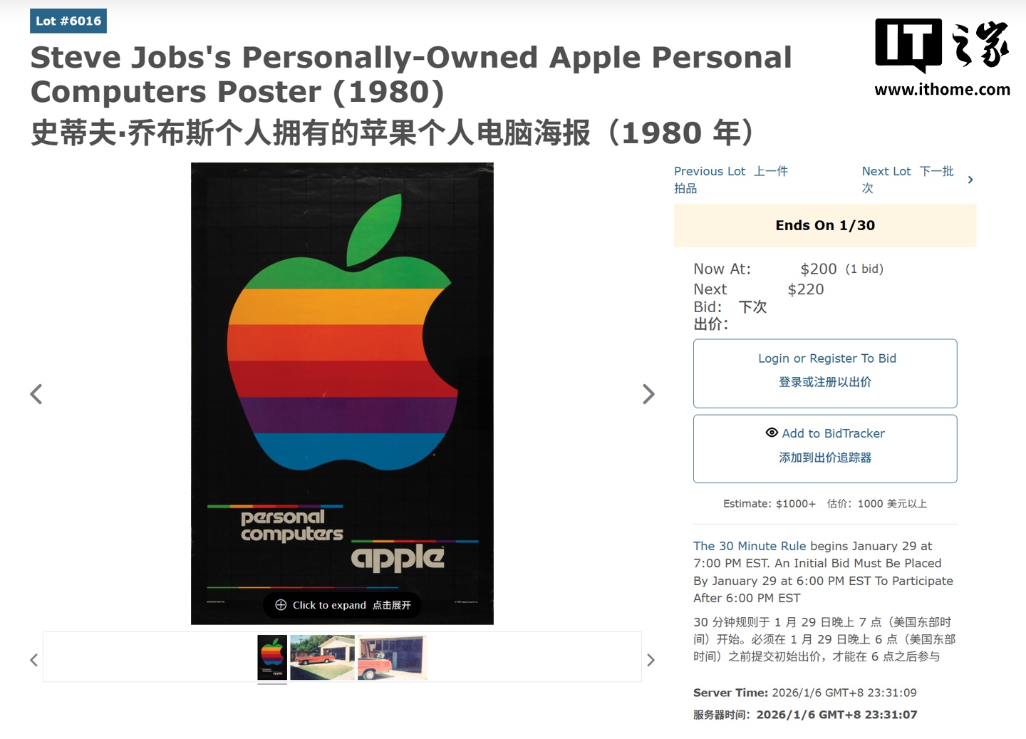据介绍,本次拍卖将于 1 月 30 日结束,其中最引人注目的产品有已知最早的 Apple I 原型机,起拍价 5 万美元(现汇率约合 35 万元人民币),估值超 50 万美元(现汇率约合 350 万元人民币)。