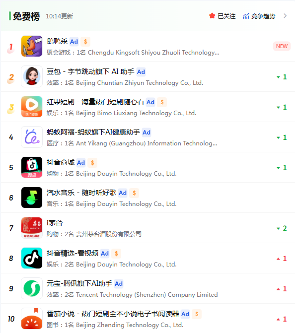 根据全球移动应用、游戏数据监测服务商点点数据的监测,1月7日上线当天,《鹅鸭杀》手游登顶中国内地iOS总榜免费榜以及游戏免费榜。