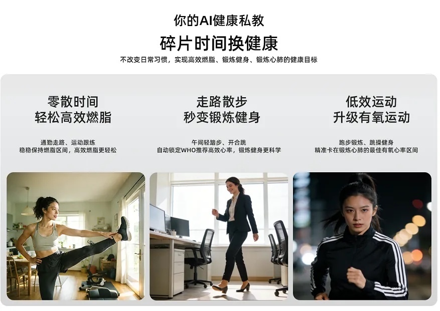 ● 智能运动更科学:它根据你的实时心率、个人目标(减脂/增肌)与状态,动态计算并语音提示适宜的运动强度。当你心率过高可能引发“过劳”时,它会及时提醒你放缓;当强度不足时,它也会鼓励你加把劲。这就像一位专注的AI教练,让你每一次锻炼都高效且安全。