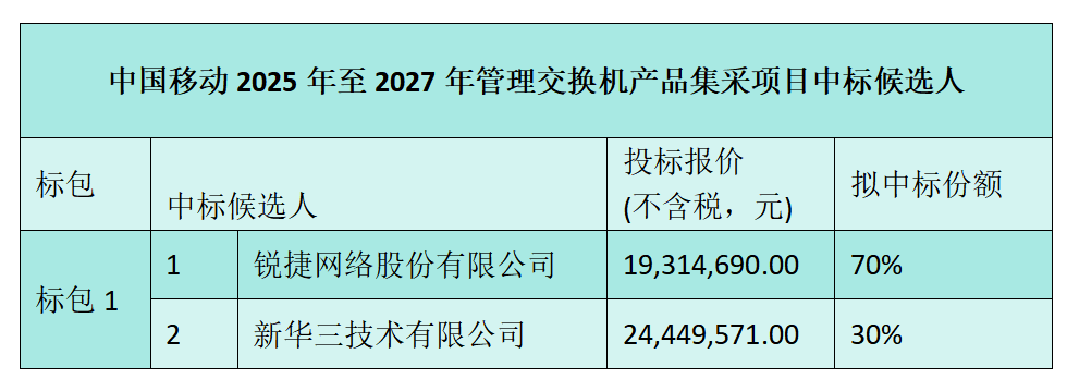 C114讯 1月7日消息(九九)中国移动采购与招标网日前发布2025年至2027年管理交换机产品集中采购项目中标候选人公示,锐捷网络和新华三中标。
