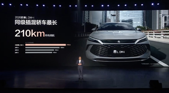价格依然是发布会的核心,2026 款秦 L DM-i 的 210km 超越型售价为 11.68 万元,搭载云辇-C 的 210km 云辇行售价则为 12.68 万元,而入门的 128km 版本在享受购置税补贴后,起步价压到了 9.28 万元。