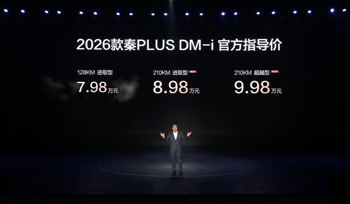 定位稍低的 2026 款秦 PLUS DM-i 杀价更狠,210km 进取型直接下探到 8.98 万元,这意味着 200 公里以上长续航插混轿车正式进入 8 万元时代,其 128km 版本的起售价则依然维持在 7.98 万元。
