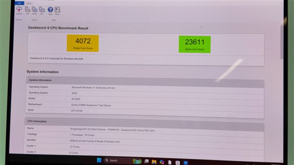 快科技1月9日消息,在Windows on Arm阵营,终于拥有了足以在性能上正面硬刚MacBook Pro顶级芯片的处理器,骁龙X2 Elite Extreme在Geekbench 6.5实测中跑出了单核4072分、多核23611分的惊人成绩。