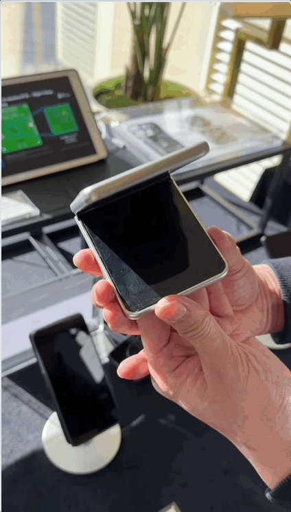 其实这是一个竖折叠屏解决方案,用户只要按一下按键,整个折叠屏就会自动展开,一步到位。