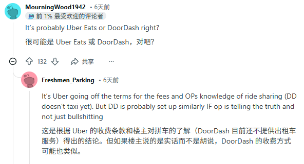 虽然原帖中并没有直接点名,但鉴于美国也没几家“头部外卖企业”,一时间网友都在推理到底是谁,火力主要集中在DoorDash和Uber Eats两家。