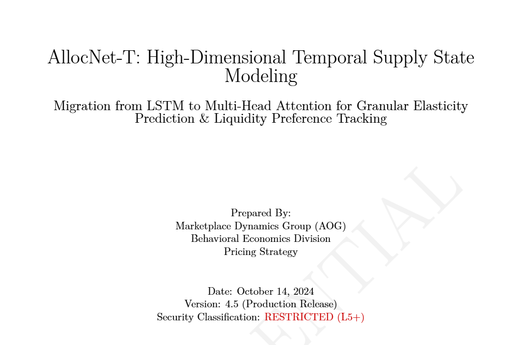 这篇文章一点开就显得很权威:标题为《AllocNet-T:高维时间供应状态建模》,署名为“市场动态小组行为经济学部门”。全文长达18页,格式接近论文,并且标明了日期、版本、保密等级,每一页都打着一个巨大的保密水印。