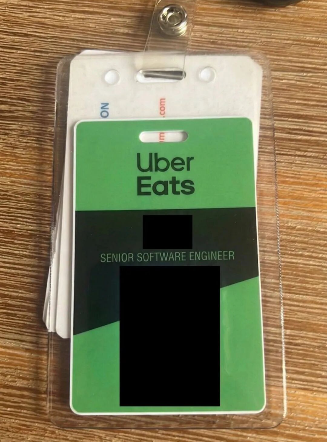 工牌上所写的职位为高级软件工程师,照片中起了一层毛边的桌子和略有污渍的塑料壳,都增强了真实感