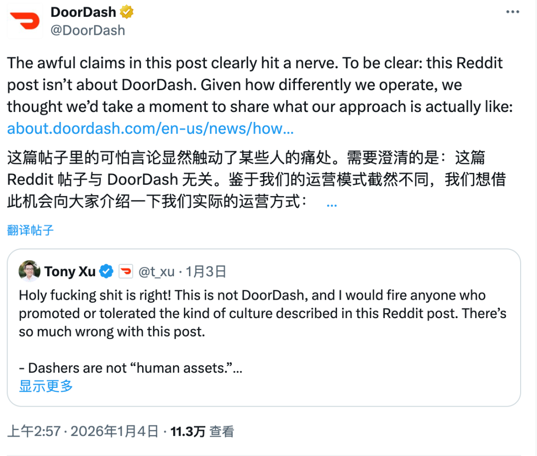 但舆论依然汹涌,Doordash的官方账号不得不在凌晨三点再次发文澄清。