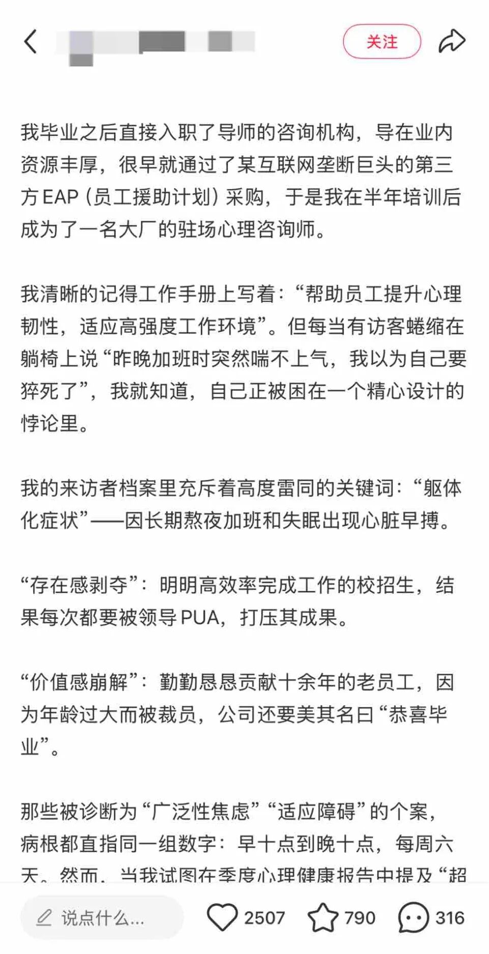 在上一份工作中,我参与过一篇关于大厂驻厂心理咨询师的稿件,线索源自一条网上正流传甚广的爆料帖。