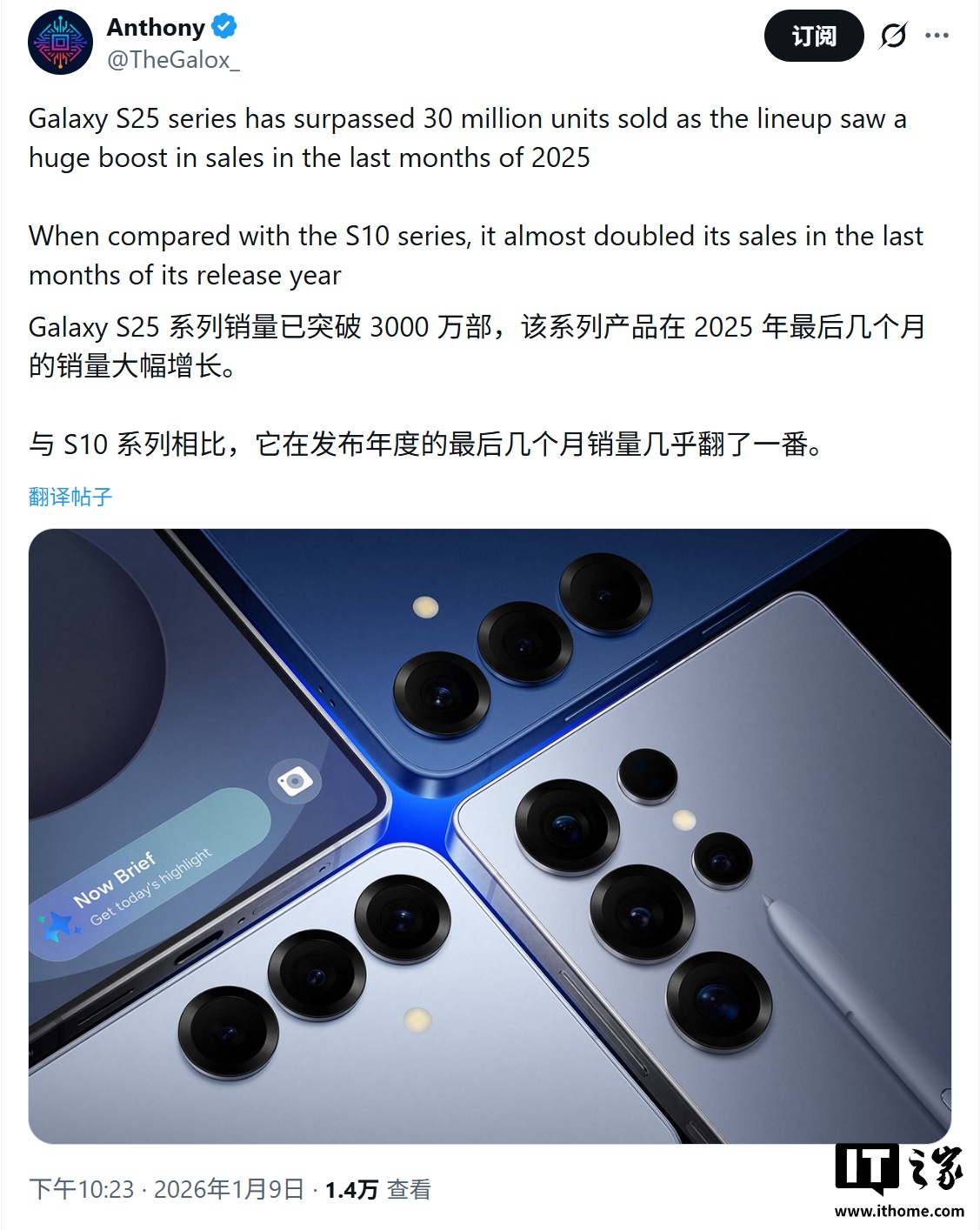 IT之家 1 月 10 日消息,消息源 @UniverseIce 昨日(1 月 9 日)在 X 平台发布推文,报道称基于 CounterPoint Research 机构数据,三星 Galaxy S25 系列手机在发布 8~9 个月后迎来“第二春”,总销量已突破 3000 万台。