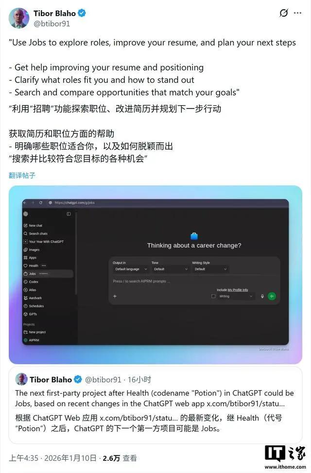 1 月 10 日消息,科技媒体 bleepingcomputer 昨日(1 月 9 日)发布博文,报道称 OpenAI 正为 ChatGPT 测试“工作”(Jobs)功能,定位 AI 职场规划助手,帮助用户优化简历、明确职业定位、筛选匹配职位及规划职业路径等。