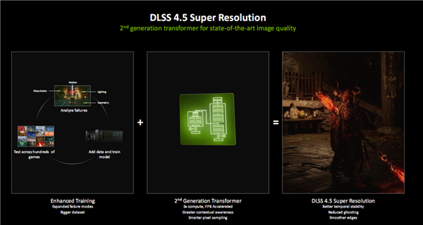 DLSS 4.5带来了两方面的重大升级,一是6倍多帧生成,二是升级至第二代Transformer模型的超分辨率。