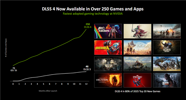 DLSS 4技术是 一年前的CES 2025上发布的,首发就支持多达75款游戏和应用,而经过一年的发展,这个数字已经超过了250!