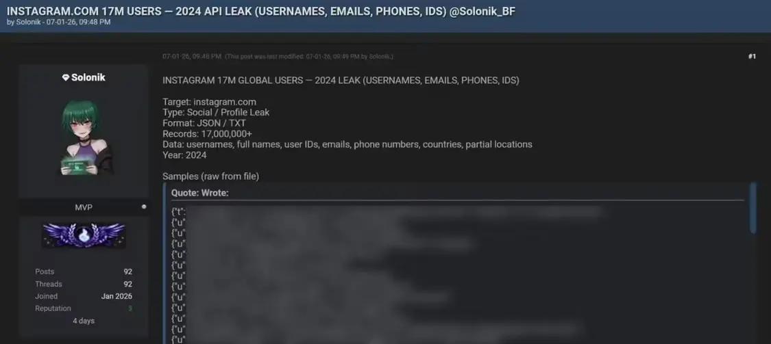 IT之家获悉,这场关于 Instagram 数据泄露的舆论风波,起因于网络安全公司 Malwarebytes 向客户发出警告,称有黑客窃取了多达 1750 万个 Instagram 账号的数据。随后,这批所谓的 Instagram 数据被免费发布在多个黑客论坛上,发布者声称数据来源于一次尚未得到官方确认的 2024 年 Instagram API 泄露事件。