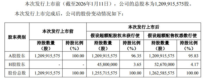 假设超额配售权未获行使,公司总股本将增至 1,255,715,575 股,其中 A 股股东持股数量仍为 1,209,915,575 股,持股比例为 96.35%;H 股股东持股数量为 45,800,000 股,持股比例为 3.65%。