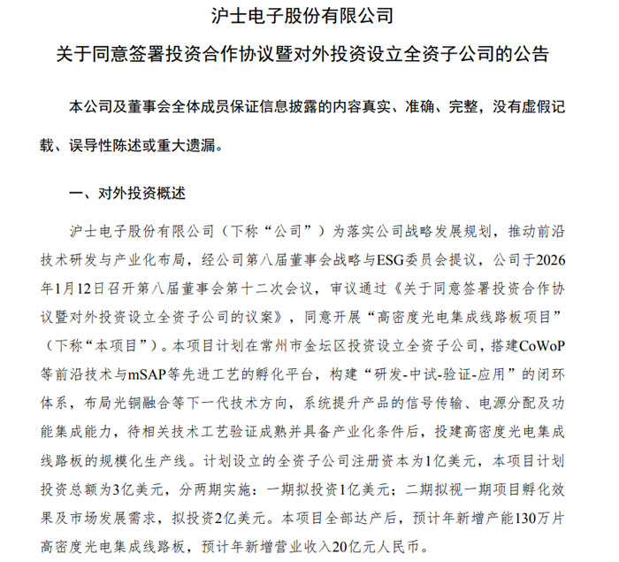 近日,沪士电子股份有限公司(证券代码:002463,证券简称:沪电股份)发布公告称,公司第八届董事会第十二次会议于 2026 年 1 月 12 日审议通过相关议案,同意签署投资合作协议,在常州市金坛区投资设立全资子公司,推进 “高密度光电集成线路板项目” 建设,总投资预计 3 亿美元,旨在落实战略发展规划,推动前沿技术研发与产业化布局。
