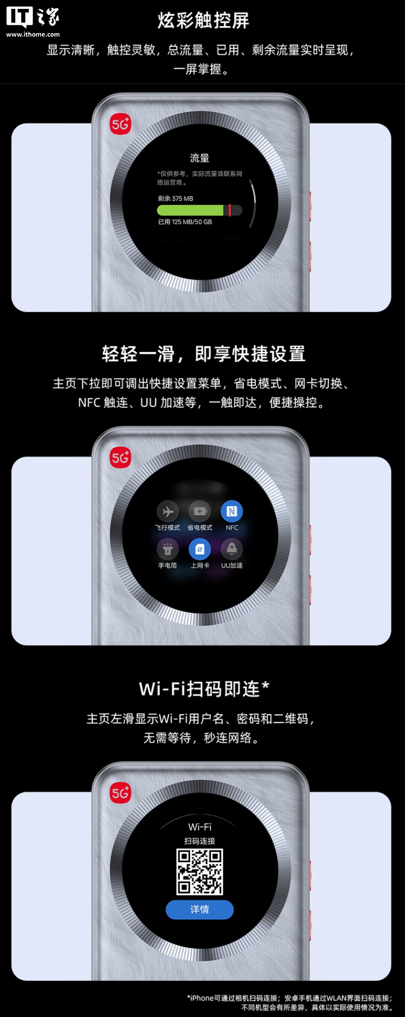 该机采用贴片 SIM 卡设计,可随时切换运营商,同时配备 NFC 技术支持快捷配网,搭载配备 9 根全向天线,支持 5G 越级上行,峰值速率可达 1200Mbps,搭载“超级天线”,可实现全频段 360 度覆盖。