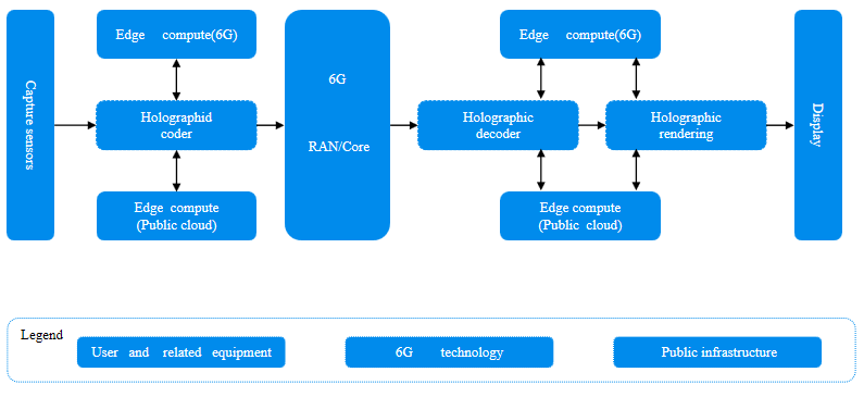 其中,新型的捕捉传感器能够精准提供人脸和身体的实时状态,在编码之前对数据进行格式转换和过滤处理,以此降低对网络的比特率要求。经压缩的全息图通过低延迟可靠的前沿通信网络,如6G网络,传输至数字化全息设备上。在数字化全息设备端,压缩的全息图在空气环境中呈现之前,会被解码和处理,而先进的渲染引擎则会充分考虑设备和渲染场景的定位及语义信息,使得全息图像能够直接在空中清晰显示。依靠前沿通信技术如6G的强大支持,可以将高性能计算转移到网络上,从而有效减少移动设备的能耗和端到端延迟。