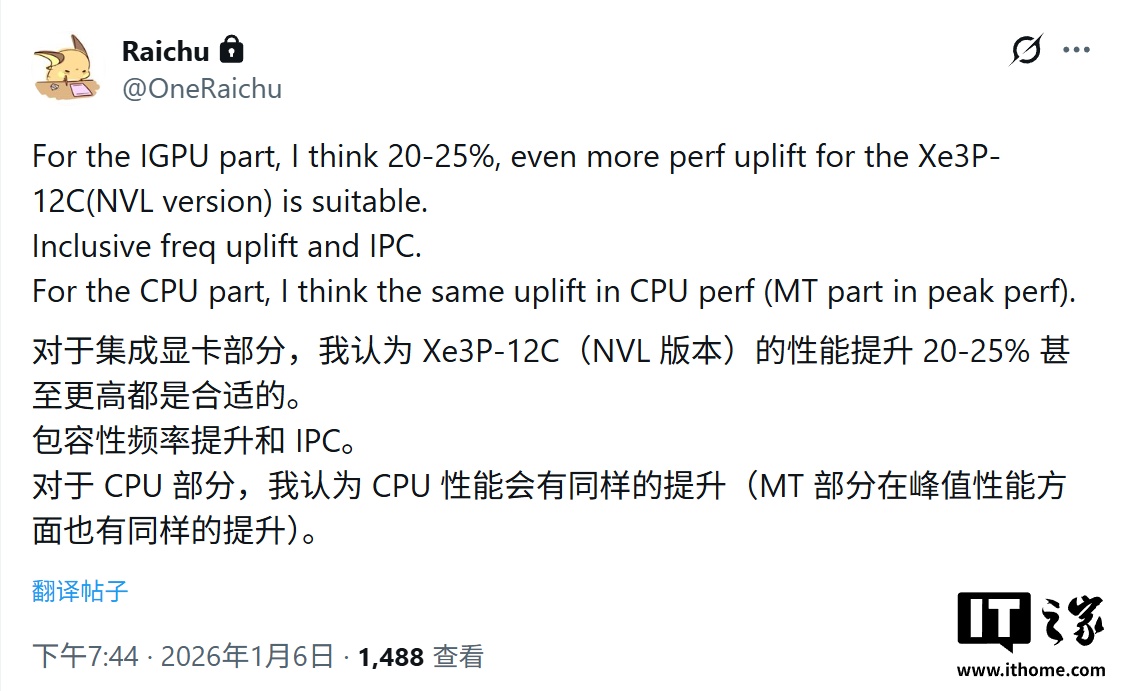 IT之家 1 月 13 日消息,消息源 @OneRaichu 于 1 月 6 日在 X 平台发布推文,称英特尔 Nova Lake 处理器将搭载 Xe3P 架构核显,性能预估比 Panther Lake 的 Xe3 架构提升 20~25%。