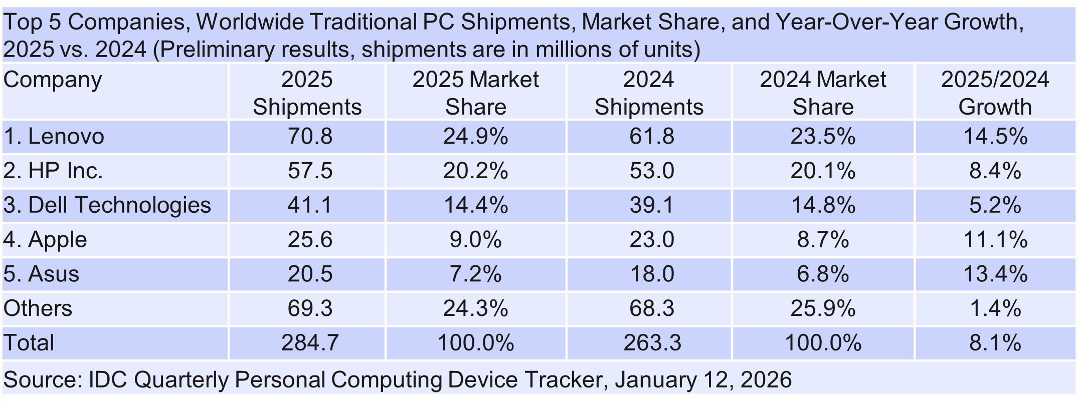 ● 当个人计算设备(PC)市场中,两家或多家厂商的出货量份额差距在 0.1 个百分点(含)以内时,IDC 将其判定为统计意义上的并列(statistical tie)。