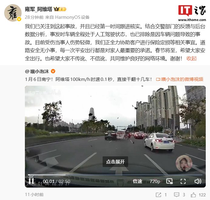 IT之家 1 月 13 日消息,阿维塔科技副总裁雍军刚刚回应了 1 月 6 日南宁的阿维塔撞车事故,称已经第一时间跟进核实,事发时车辆全程处于人工驾驶状态,也已排除是因车辆问题导致的事故。