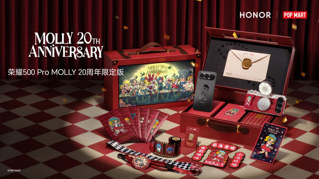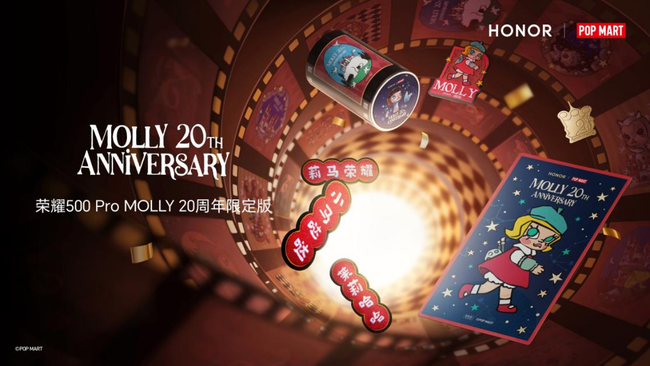 今日,荣耀正式官宣与全球知名潮流IP泡泡玛特MOLLY进行联名合作,推出荣耀500 Pro MOLLY 20周年限定版联名产品。正值MOLLY诞生20周年之际,此次合作不仅是双方在“科技+潮玩”领域的重要探索,更被业界视为“手机圈首个官方深度定制版痛机”正式亮相,引领数码产品与潮流文化融合进入了全新阶段。