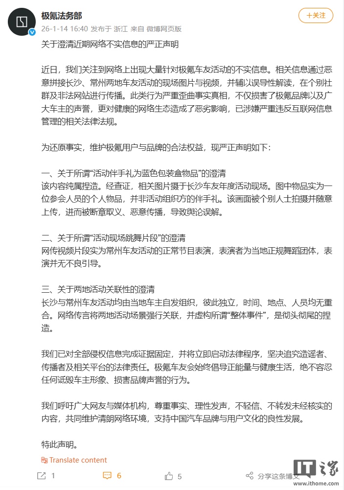 IT之家 1 月 14 日消息,极氪法务部今日发布《关于澄清近期网络不实信息的严正声明》,声明指出,近日网络上出现大量针对极氪车友活动的不实信息。相关信息通过恶意拼接长沙、常州两地车友活动的现场图片与视频,并辅以误导性解读,在个别社群及非法网站进行传播。