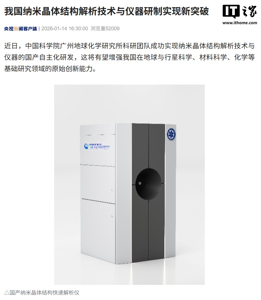 IT之家 1 月 14 日消息,据央视新闻今日报道,中国科学院广州地球化学研究所科研团队成功实现纳米晶体结构解析技术与仪器的国产自主化研发,这将有望增强我国在地球与行星科学、材料科学、化学等基础研究领域的原始创新能力。
