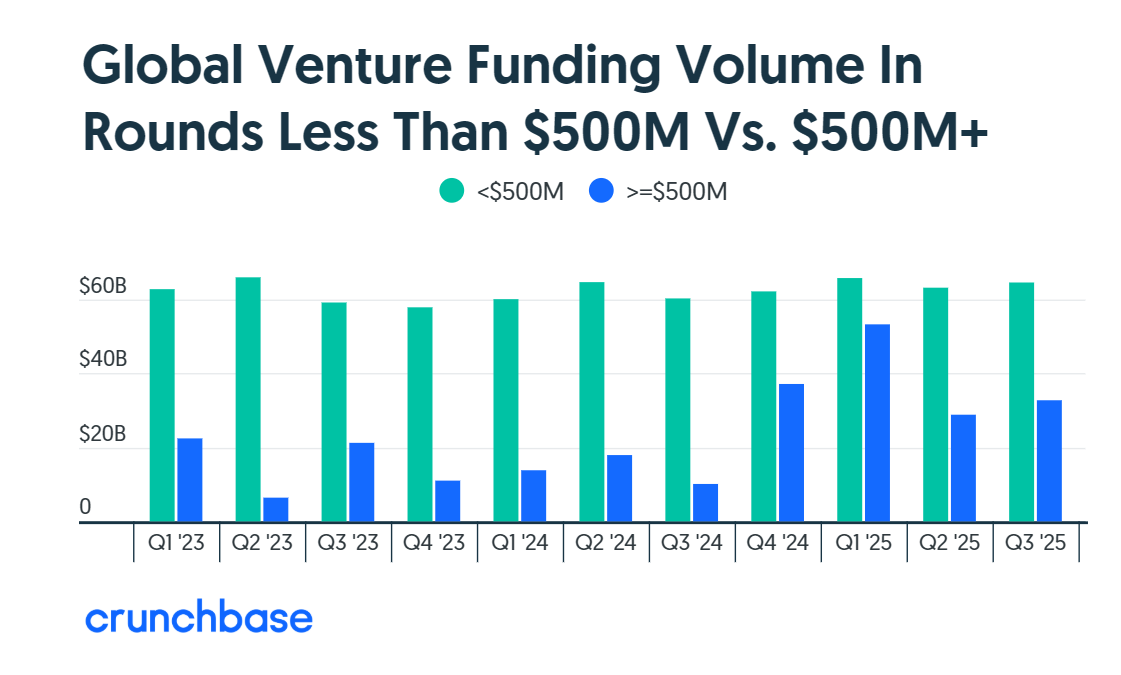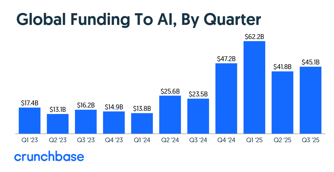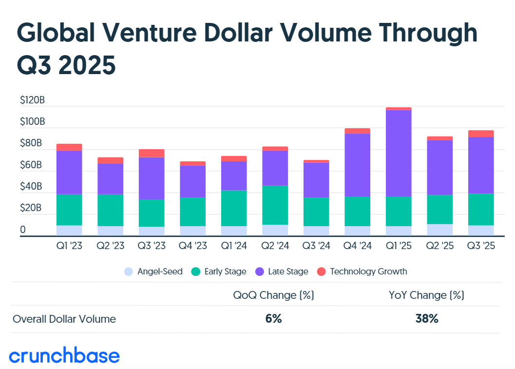 Crunchbase的数据显示,2025年第三季度全球风险投资大幅增长,同比上涨38%,巨额融资交易,特别是人工智能行业的巨头公司,持续引领风潮。