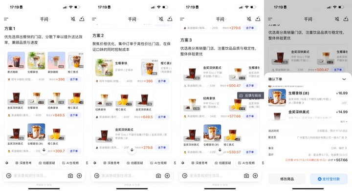 并且,大部分生成的结果,都是用户可以直接用支付宝下单,点一杯奶茶最快只需要 30 秒。