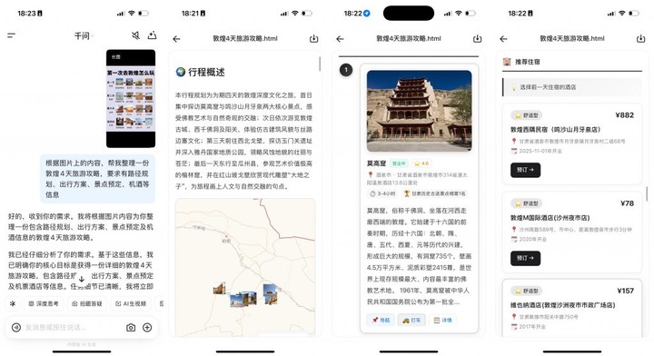 以往,想要自己定制一条旅游线路,用户不可避免往返平台做攻略和预订,消耗不少时间精力,现在一句话,千问就能帮你把事情安排妥当,用户唯一要做的事情,就是最后的付款。