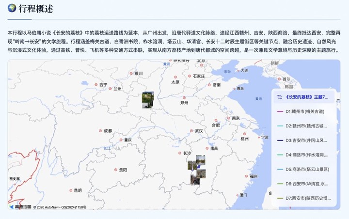 但千问只用了不到 5 分钟,就把整个路线和行程安排交付到我手上:从广州出发,经江西,直抵陕西,这刚好就是小说中主角最终选择的路线。