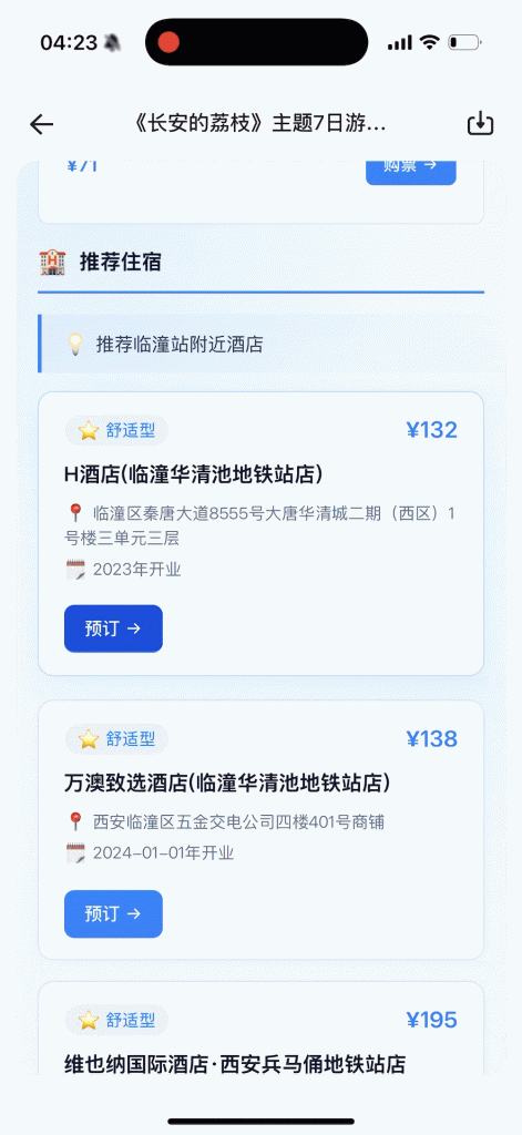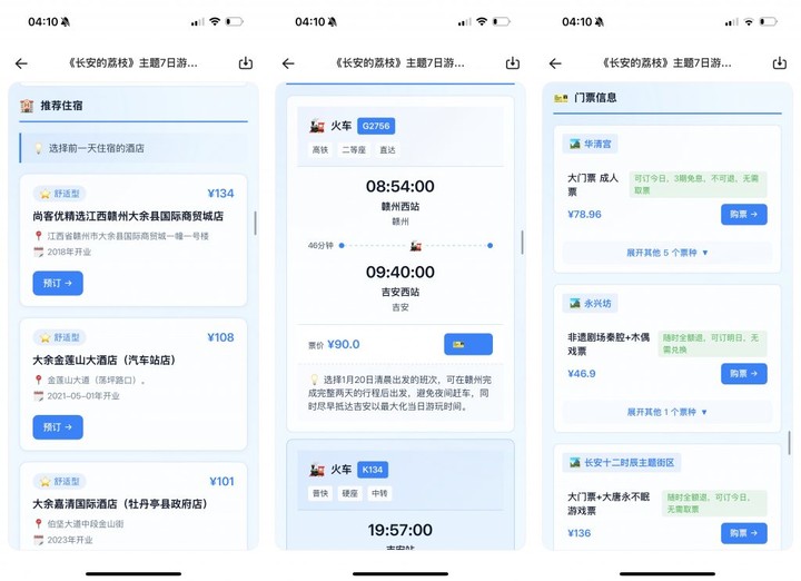 路线安排只是基础,它规划行程的同时,还能直接把「手」伸进了飞猪和高德的后台,将景点、交通、酒店的预订信息一并附上,坐哪趟火车,订哪家酒店,全部仔仔细细安排明白。