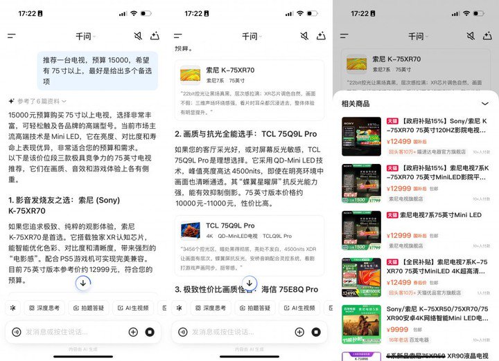 像买电视这样选择繁多、需要在各个平台反复比对,且需求因人而异的购物场景,非常适合交给千问来处理。
