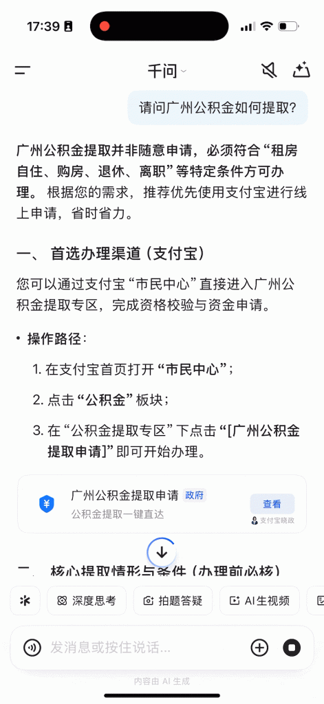 可以这么说,千问或许是世界上唯一一个能直接将公积金提取入口带到你面前的 AI 机器人。