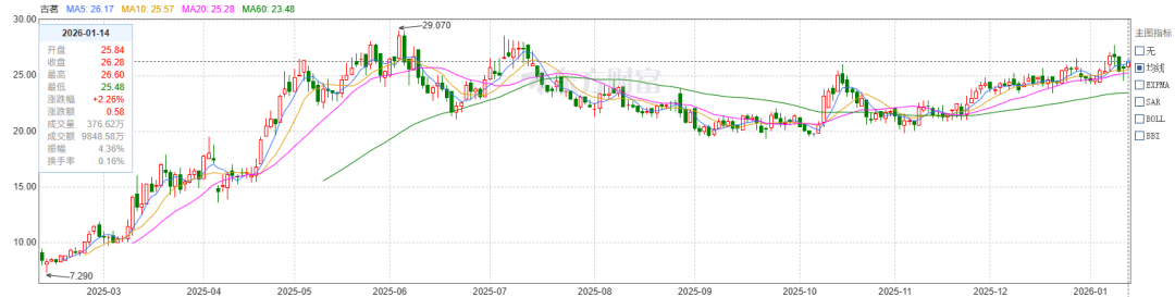 2025年2月登陆港交所以来,古茗股价持续上行,市值稳步增长。截至1月14日收盘,古茗股价为26.28港元/股,对比上市9.94港元/股上涨164.39%,总市值为625.0亿港元。