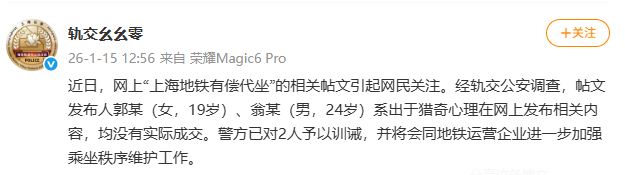 新京报讯 据@轨交幺幺零 消息,近日,网上“上海地铁有偿代坐”的相关帖文引起网民关注。经轨交公安调查,帖文发布人郭某(女,19岁)、翁某(男,24岁) 系出于猎奇心理在网上发布相关内容,均没有实际成交。警方已对2人予以训诫,并将会同地铁运营企业进一步加强乘坐秩序维护工作。