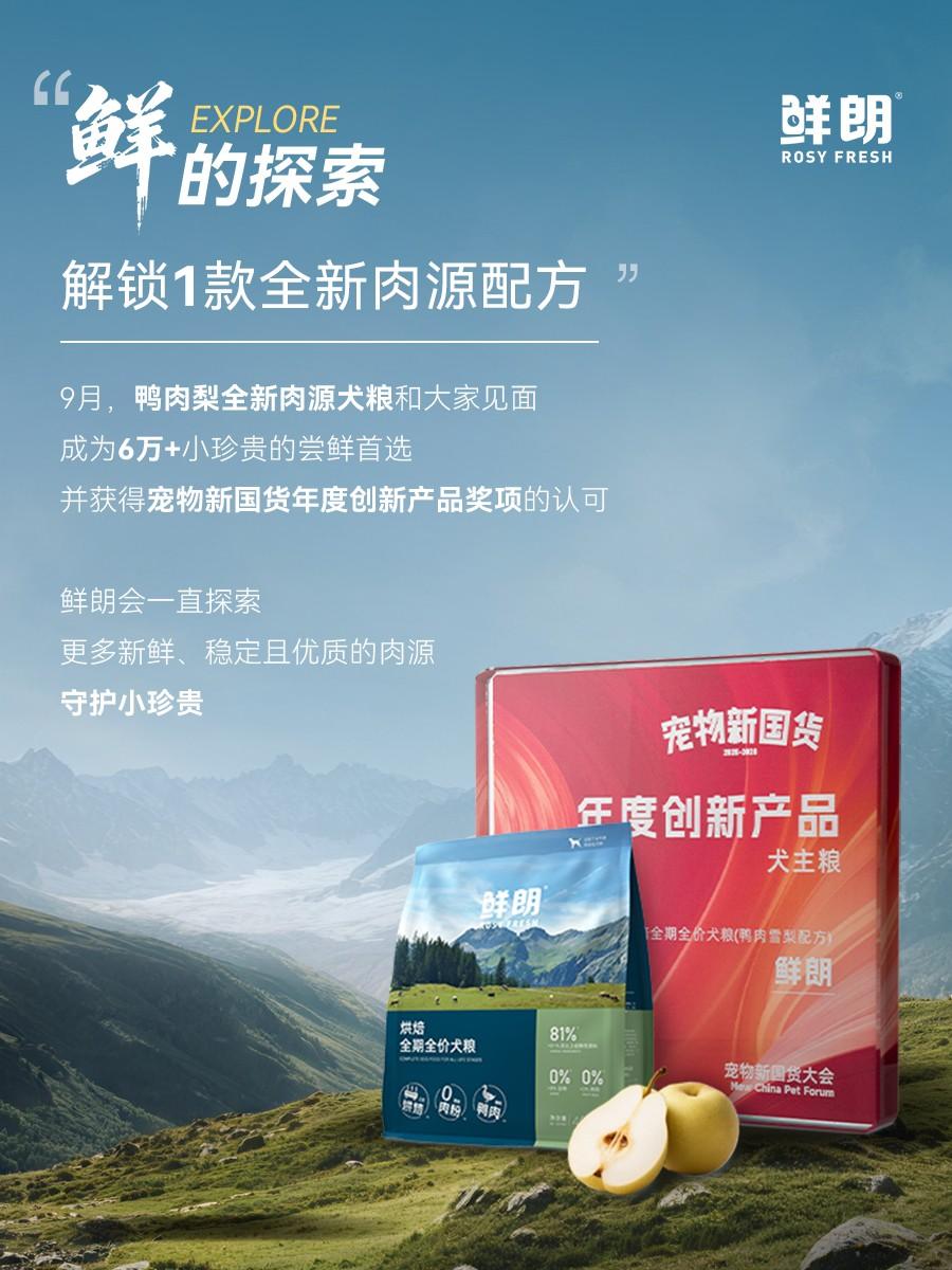 2025年9月,这种强大的号召力再一次表现——鲜朗推出全新肉源配方鸭肉雪梨配方烘焙犬粮,凭借其出众的品质,上市三个月内即收获超6w+用户的验证,强势跻身平台热卖榜单,并荣获 “宠物新国货年度创新品牌” 称号,再次印证了其“上市即爆款”的产品实力。
