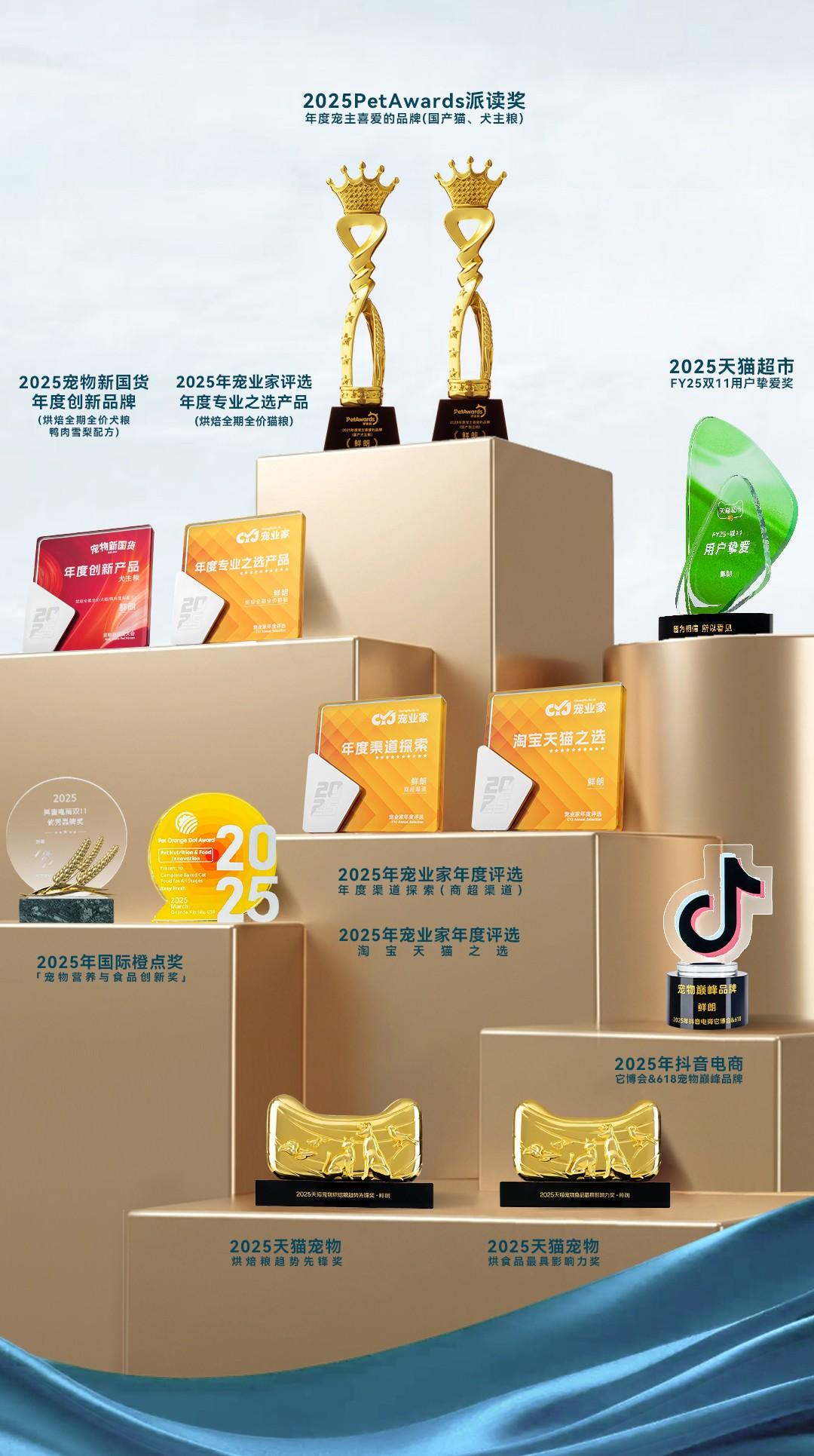 与此同时,鲜朗亦在2025年赢得了行业的广泛共识,全年揽获13项权威荣誉。从代表专业评审的宠物新国货以及PetAwads派读奖的年度大奖,到平台颁发的天猫宠物食品最具影响力奖,再到国际性的橙点奖,这些来自多维度、高级别的认可,共同确立了鲜朗在高端宠粮领域的定义者与领导者地位。