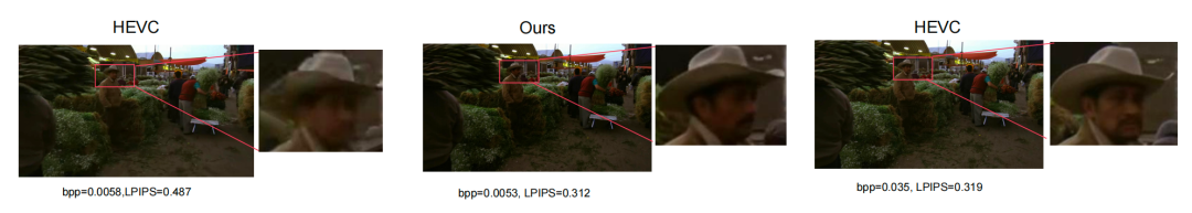 传统霸主 HEVC 已经彻底崩溃,画面基本是马赛克乱舞,LPIPS 数值飙升(越低越好)。