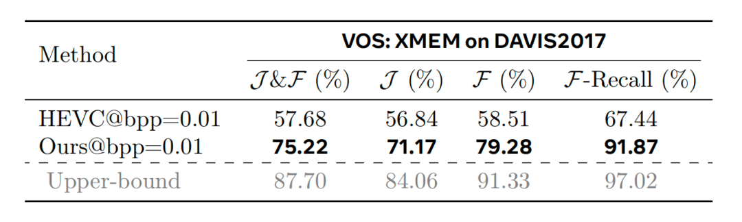 为此,团队在 DAVIS2017 视频分割任务上进行了验证;结果显示,在 bpp=0.01 的极限压缩下,GVC 重建视频的 J&F 指标(衡量分割准确度)显著高于 HEVC。